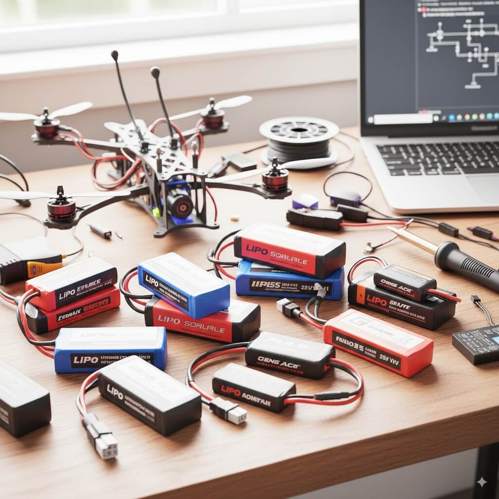 리튬 폴리머(LiPo) 배터리의 핵심 용어 이해하기 LiPo 배터리를 선택하고 사용하기 전에 반드시 알아야 할 세 가지 핵심 용어가 있습니다. 바로 셀 수, 용량(mAh), C-레이트입니다. 이 용어들을 명확히 이해하면 여러분의 드론에 가장 적합한 배터리를 선택하고, 배터리의 성능을 최대한으로 끌어낼 수 있습니다.1. 셀 수 (S)배터리의 셀 수(S)는 배터리 안에 직렬로 연결된 셀의 개수를 의미합니다. 각 셀은 Full 충전 시 약 4.2V, 공칭(Nomal) 전압은 3.7V의 전압을 가집니다. 예를 들어, 3S 배터리는 3개의 셀이 직렬로 연결되어 있어, 공칭(Nomal) 전압은 3 \times 3.7V = 11.1V 가 됩니다. 셀 수가 많을수록 드론에 더 높은 전압을 공급하여 모터의 출력이 강..